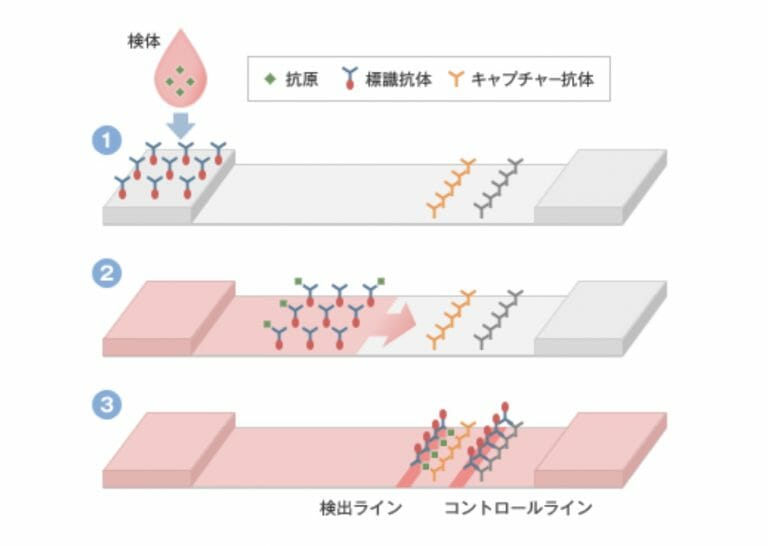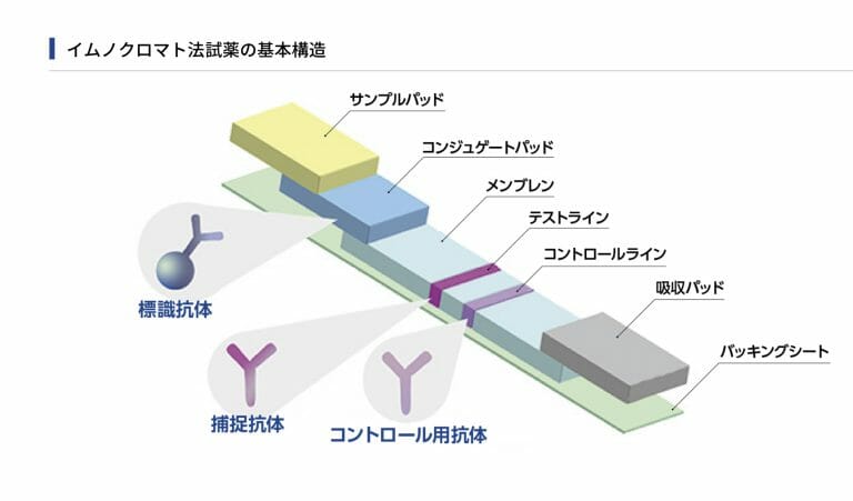 検出感度が高いPCRよりも感度は低いものの、15分程度で抗原の検出が可能な測定方法で、「イムノクロマト」と原理を利用しています。
