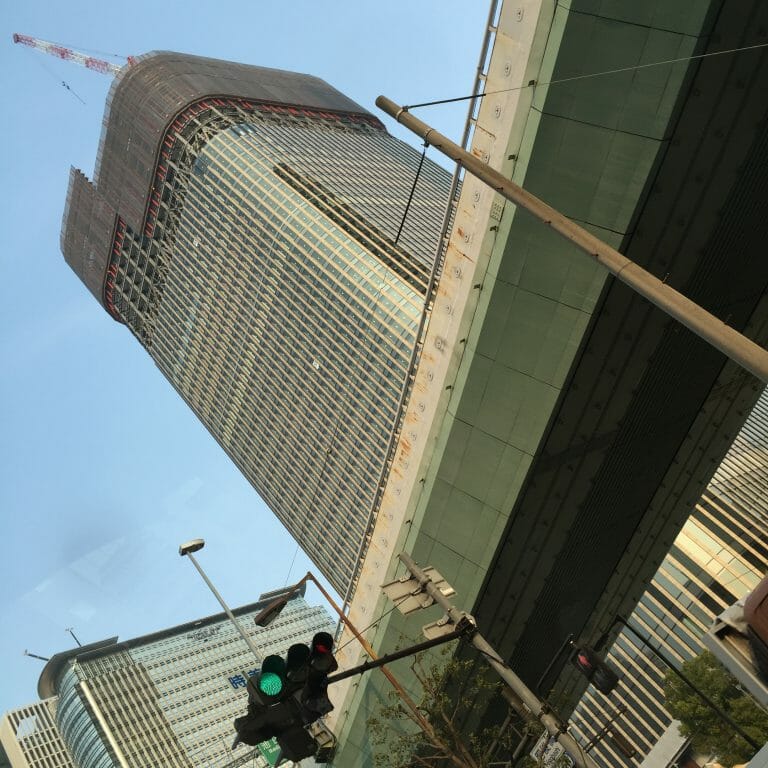 右手が梅田方面です。コンラッド大阪は、このツインビルの左側のビルに入っています。まだ、2016年2月では建設途中でした。右側のビルは、フェスティバルホールが入っています。