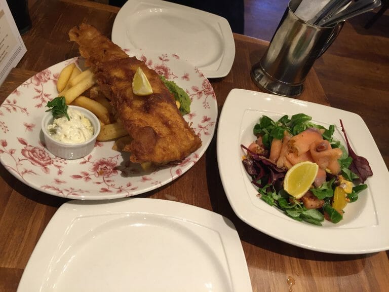 フィッシュアンドチップスとサーモンサラダ。サラダの野菜は日本では食べたことのない葉っぱでしたが、クセはなくてイギリスを味わいました。