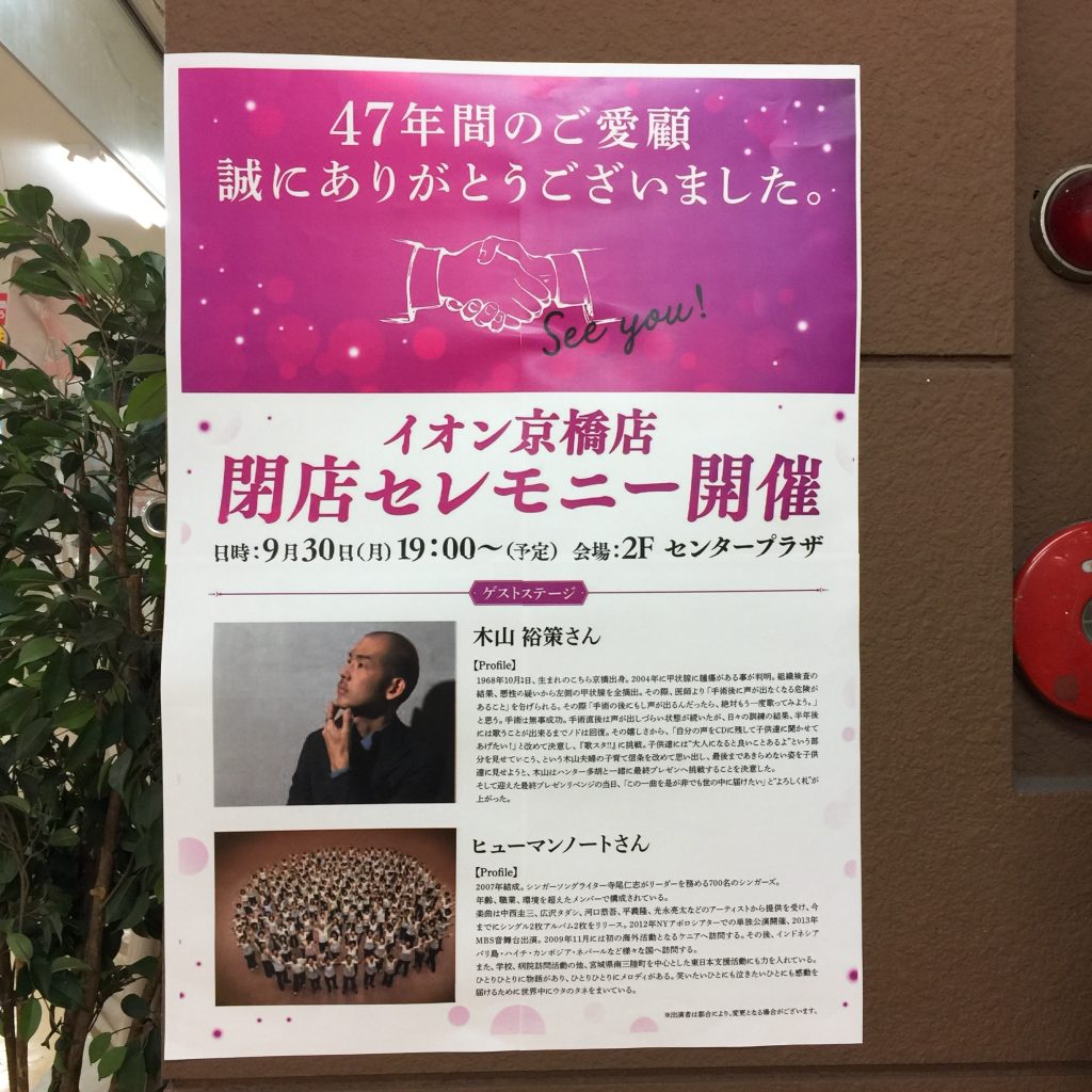 京橋ダイエーさま、日本の高度成長期とバブル崩壊、そして今日まで、本当にお疲れ様でした。京橋ダイエーは、今はイオンになっていますが、建物としては47年という長い歴史を持っています。