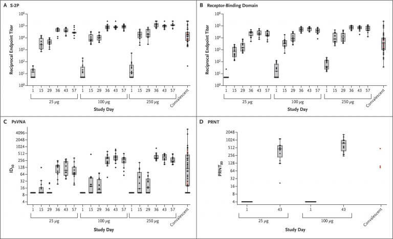 以下の29日と57日のデータから投与量が多いほど、抗体価が上昇しているのがわかる
